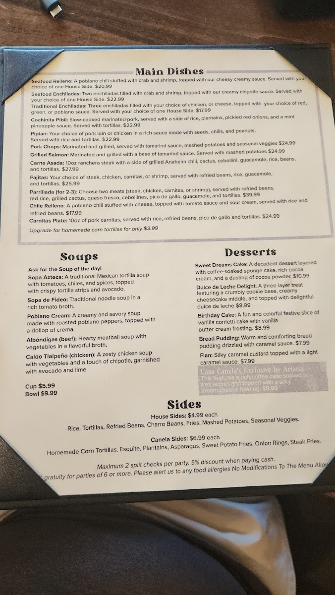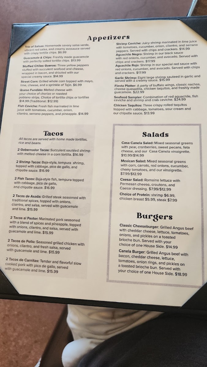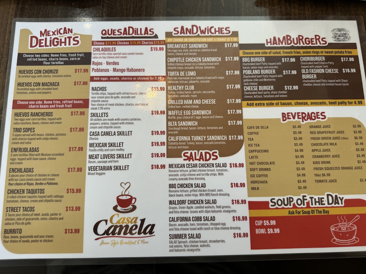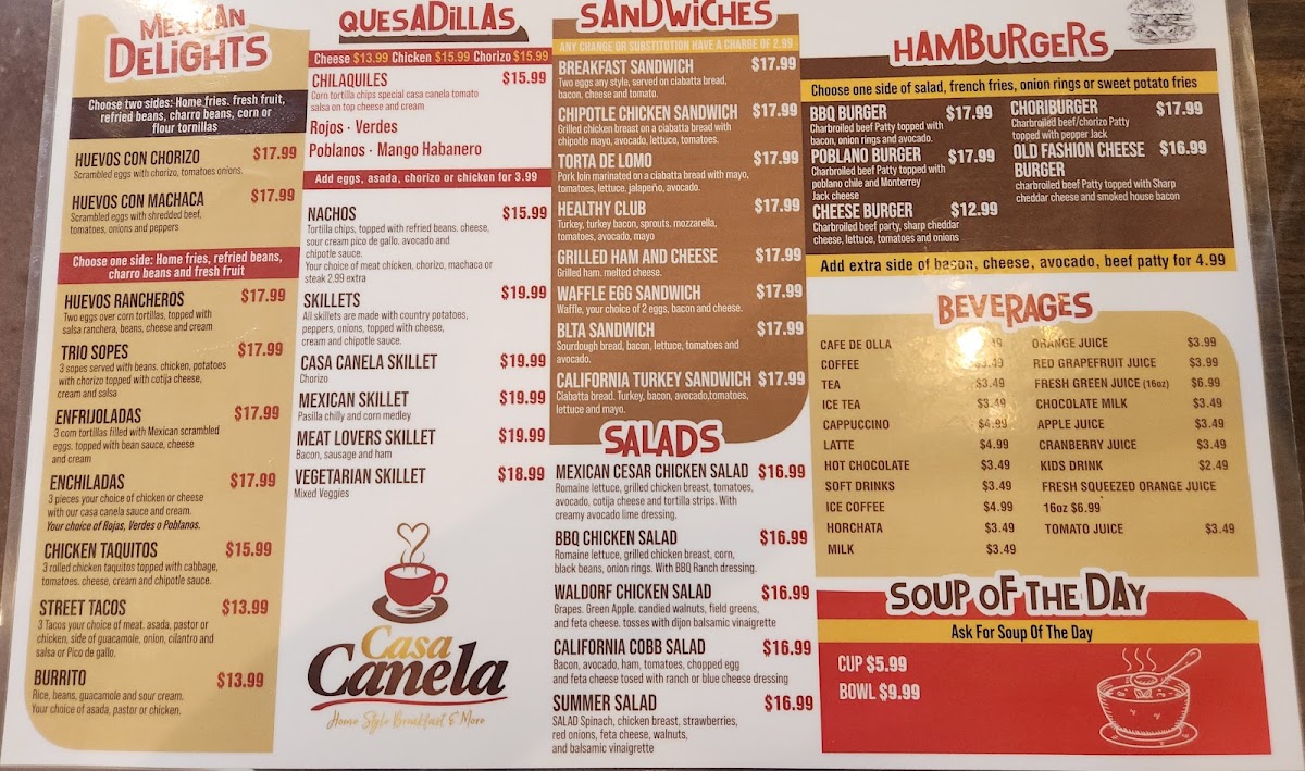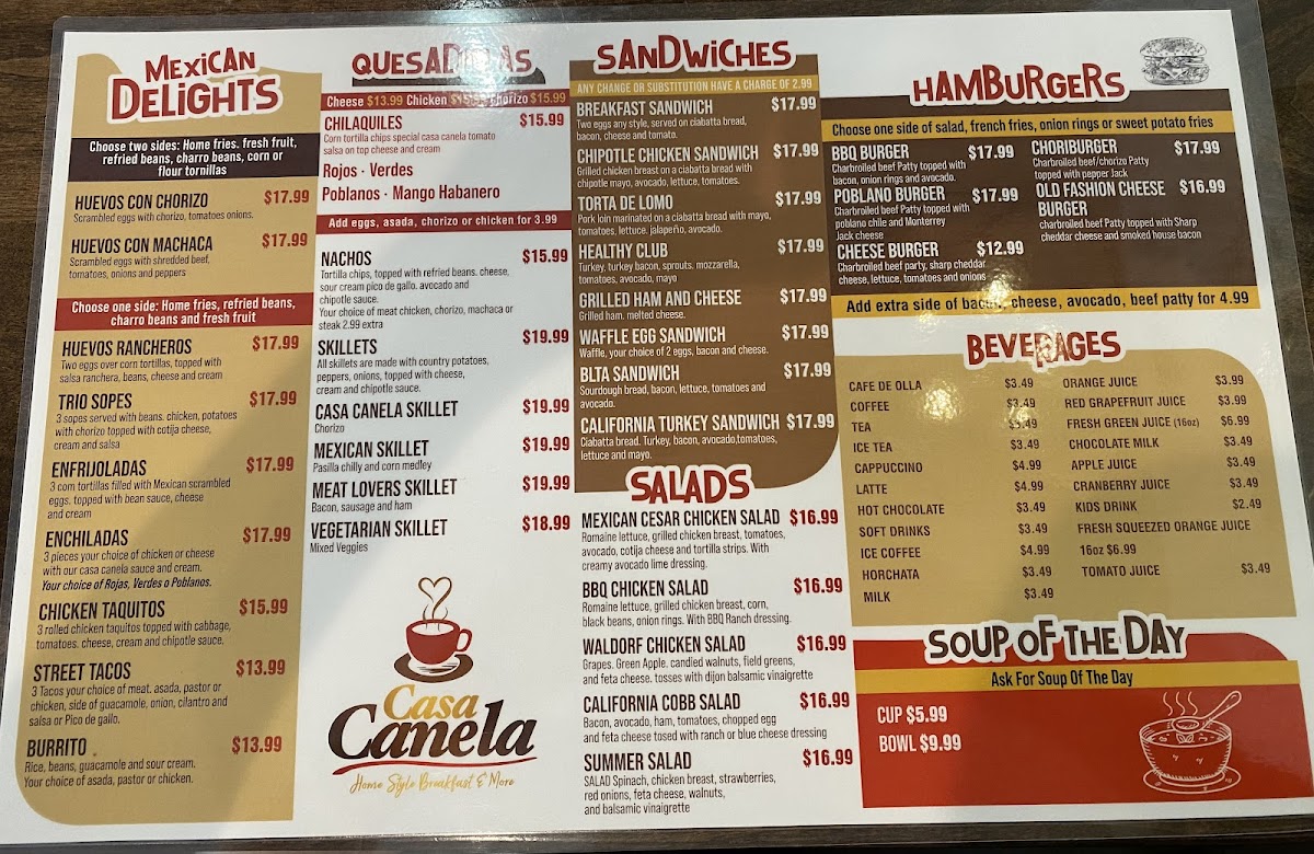 Casa Canela’s menu brings together a generous mix of comforting classics and vibrant Mexican flavors, making it easy for diners to find something satisfying at any time of day. From hearty starters like the Fiesta Platter, Fish Ceviche, and Chicken Taquitos to crisp, fresh options such as the Summer Salad and California Cobb Salad, the offerings feel both varied and approachable. Traditional favorites stand out in the Mexican Delights section, where dishes like the Burrito Con Machaca, Meat Lovers Skillet, Enchiladas Verdes, and Nachos deliver bold flavors, while soups such as Albóndigas (Beef), Sopa Azteca, and Poblano Cream provide warm, comforting choices. Breakfast lovers will appreciate the wide selection-from sweet