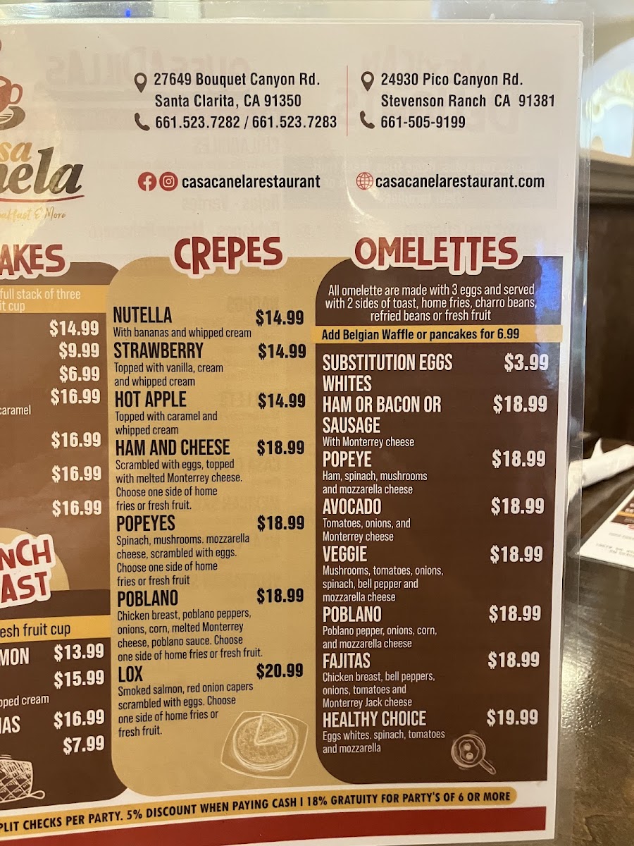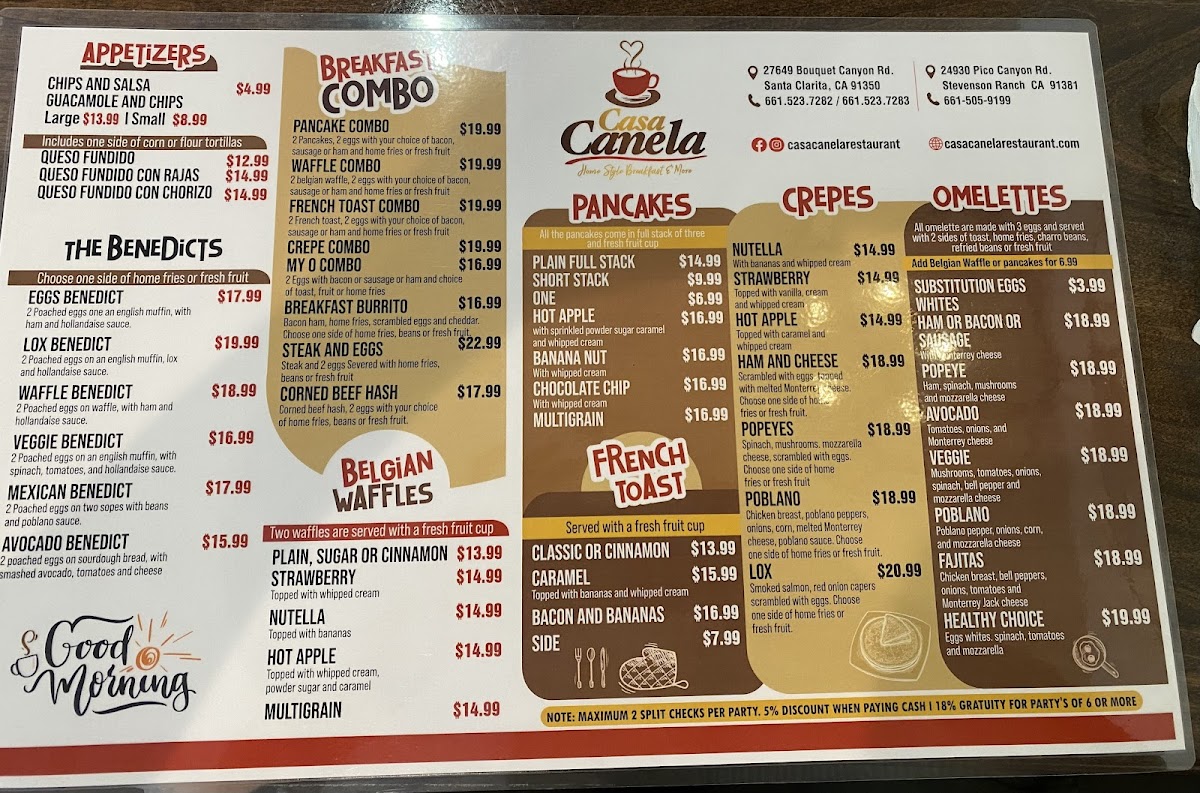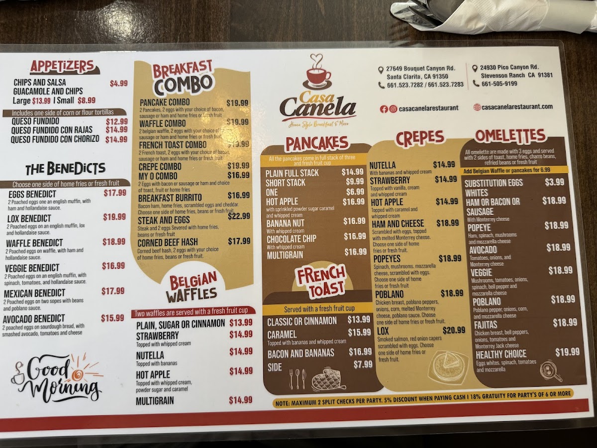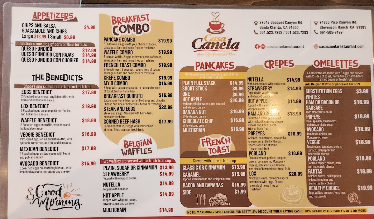 Casa Canela’s menu brings together a generous mix of comforting classics and vibrant Mexican flavors, making it easy for diners to find something satisfying at any time of day. From hearty starters like the Fiesta Platter, Fish Ceviche, and Chicken Taquitos to crisp, fresh options such as the Summer Salad and California Cobb Salad, the offerings feel both varied and approachable. Traditional favorites stand out in the Mexican Delights section, where dishes like the Burrito Con Machaca, Meat Lovers Skillet, Enchiladas Verdes, and Nachos deliver bold flavors, while soups such as Albóndigas (Beef), Sopa Azteca, and Poblano Cream provide warm, comforting choices. Breakfast lovers will appreciate the wide selection-from sweet